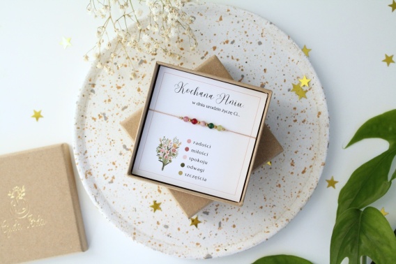 Bransoletka zapakowana jest w pudełeczko prezentowe w kolorze brązowym lub różowym (do wyboru), wraz z personalizowaną dedykacją na urodziny. Na karcie nadrukowany jest bukiet kwiatów w kolorystyce uzupełniającej kompozycję kamieni. Treść słów użytych w dedykacji możesz zmienić lub uzupełnić własnym nagłówkiem, tworząc wyjątkowy i osobisty prezent.