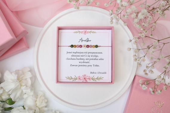 Bransoletka zapakowana jest w pudełeczko prezentowe w kolorze brązowym lub różowym (do wyboru), wraz z personalizowaną dedykacją dla Dziecka. Na karcie nadrukowana jest kwiatowa grafika, która pięknie uzupełnia całość. Treść dedykacji możesz całkowicie zmienić lub uzupełnić własnym nagłówkiem i podpisem, tworząc wyjątkowy i osobisty prezent.