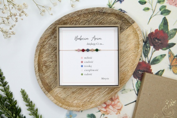 Bransoletka zapakowana jest w pudełeczko prezentowe w kolorze brązowym lub różowym (do wyboru), wraz z personalizowaną dedykacją dla Babci. Na karcie nadrukowany jest delikatny motyw kolorowych kropek – każda z nich symbolizuje jedno uczucie i jeden powód do wdzięczności. Treść dedykacji możesz dowolnie zmienić lub uzupełnić własnym podpisem, tworząc osobisty i wyjątkowy prezent.