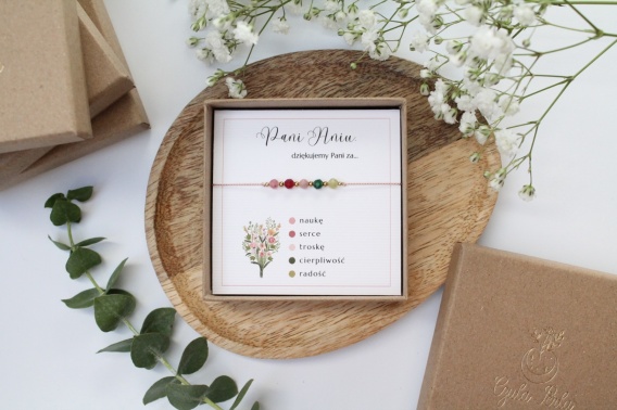 Bransoletka zapakowana jest w pudełeczko prezentowe w kolorze brązowym lub różowym (do wyboru), wraz z personalizowaną dedykacją dla Nauczycielki. Na karcie nadrukowany jest bukiet kwiatów w kolorystyce uzupełniającej kompozycję kamieni. Treść słów użytych w dedykacji możesz zmienić lub uzupełnić własnym nagłówkiem, tworząc wyjątkowy i osobisty prezent.