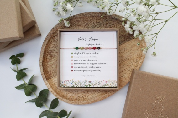 Bransoletka zapakowana jest w pudełeczko prezentowe w kolorze brązowym lub różowym (do wyboru), wraz z personalizowaną dedykacją dla Nauczycielki. Treść sentencji użytych w dedykacji możesz zmienić lub uzupełnić własnym nagłówkiem i podpisem, tworząc wyjątkowy i osobisty prezent.